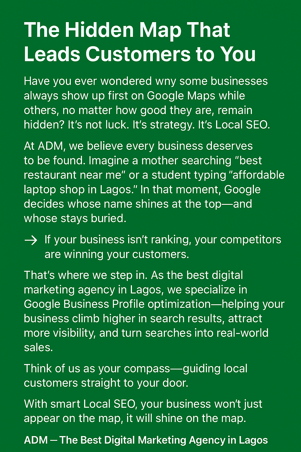 ADM is a trusted marketing agency in Lagos helping startups, local shops, and service businesses grow with smart and simple digital strategies. We specialize in Local SEO services, Google Business Profile optimization, and social media management that increase visibility, boost calls, and drive steady customer growth. Our team helps Lagos businesses rank higher on Google Maps, connect with the right audience, and turn online searches into loyal customers. From affordable marketing solutions and lead generation to content creation and reputation management, ADM provides everything you need to build a stronger online presence and achieve lasting success in Lagos.